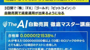 The AI自動売買 徹底マスター講座とは?The AI自動売買 徹底マスター講座AIによる、厳しい10段階のテストに合格した150戸とのロジックのみを採用。最大224琴のEAを一度に入手することが可能に。※公式サイトにて、バックテストの結...