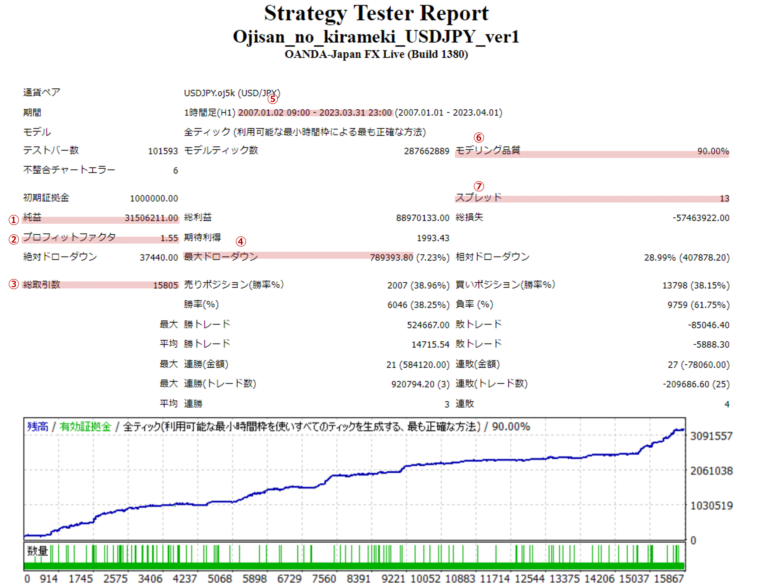 1) 複利取引の設定(17年間のバックテスト)で、100万円→1.4億円達成