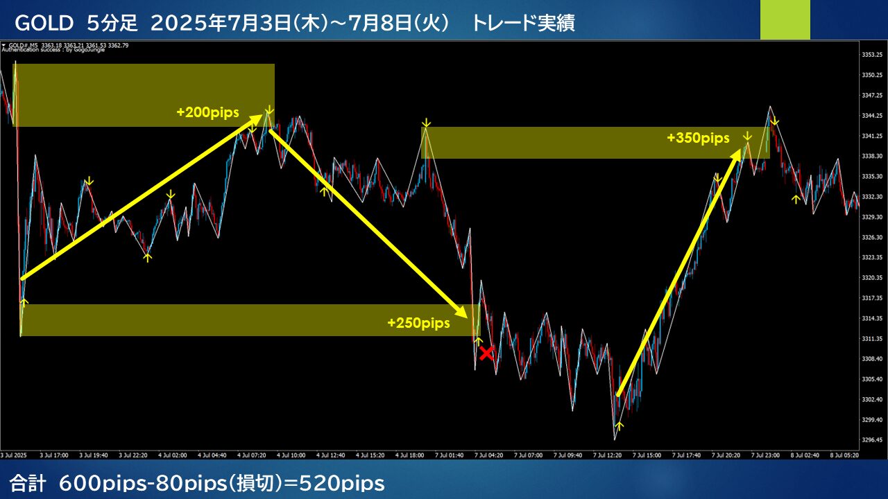 ・1トレードでGOLD170pips、2トレードで195pipsなどなど。